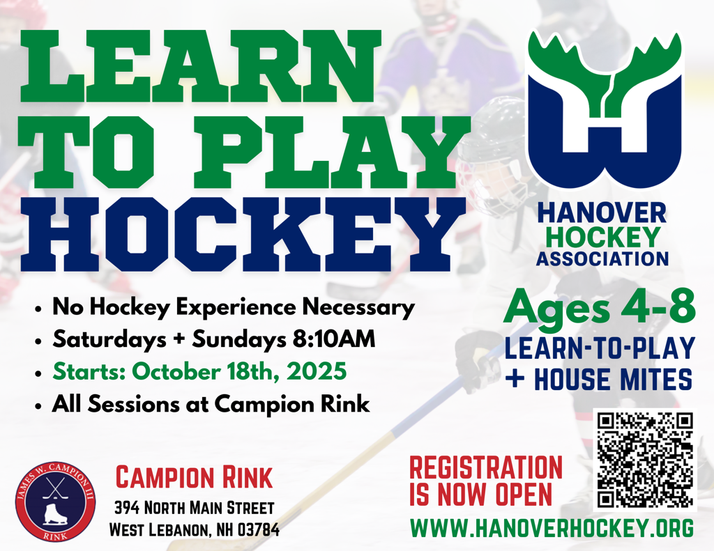 New players ages 4-8 with no previous hockey experience are invited to join Hanover Hockey's Learn To Play Program. We expect that LTP players have enough skating skill to move forward on the ice without assistance. The on-ice sessions will feature an active clinic-style approach to the practices with lots of hands-on coaching and instruction.